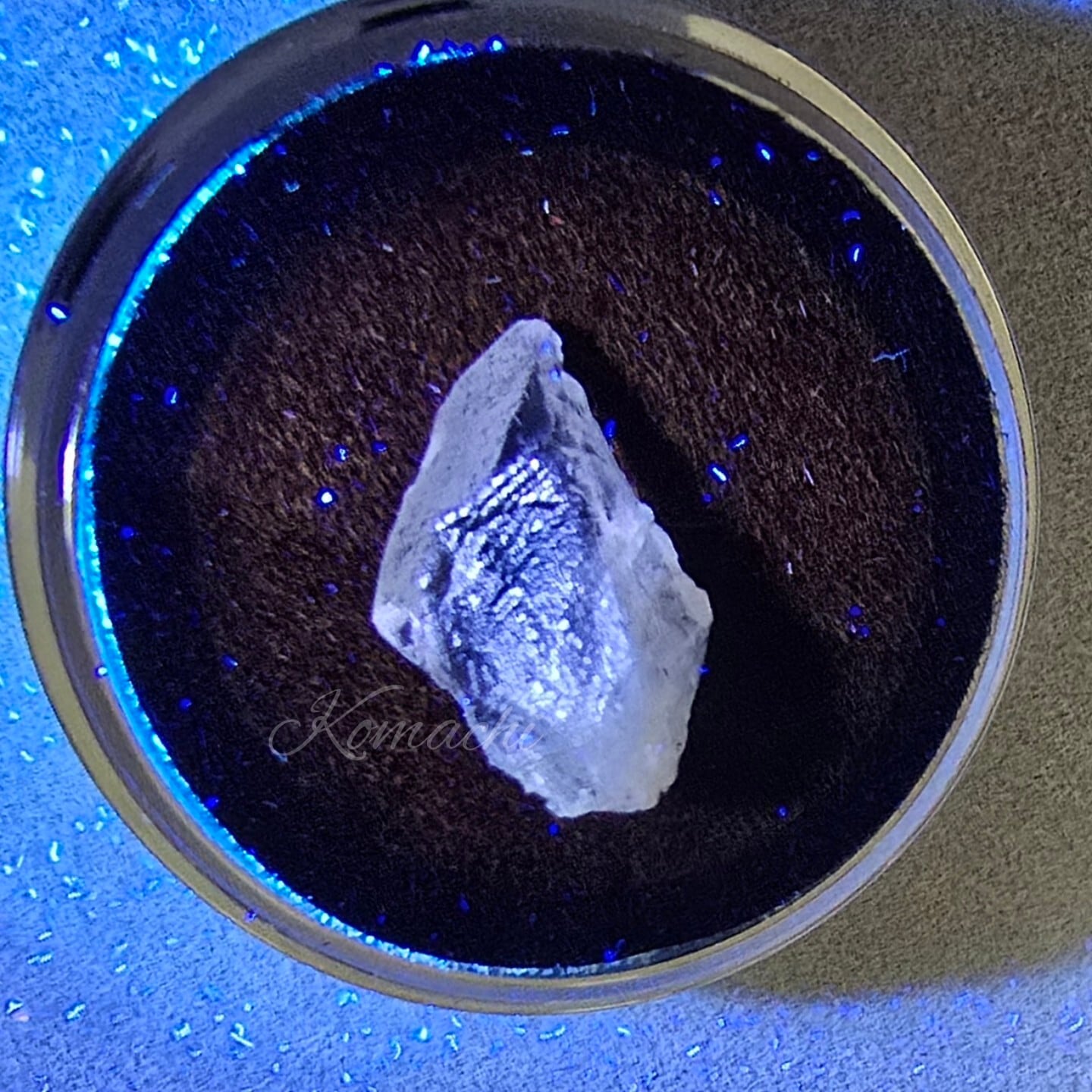 透明度の高い結晶の奥に、ほんのりと浮かぶ紫光。それはまるで、宇宙の叡智を封じ込めたような神秘。蛍光検査により「すみれ色」の輝きを放つ奇跡の一石。