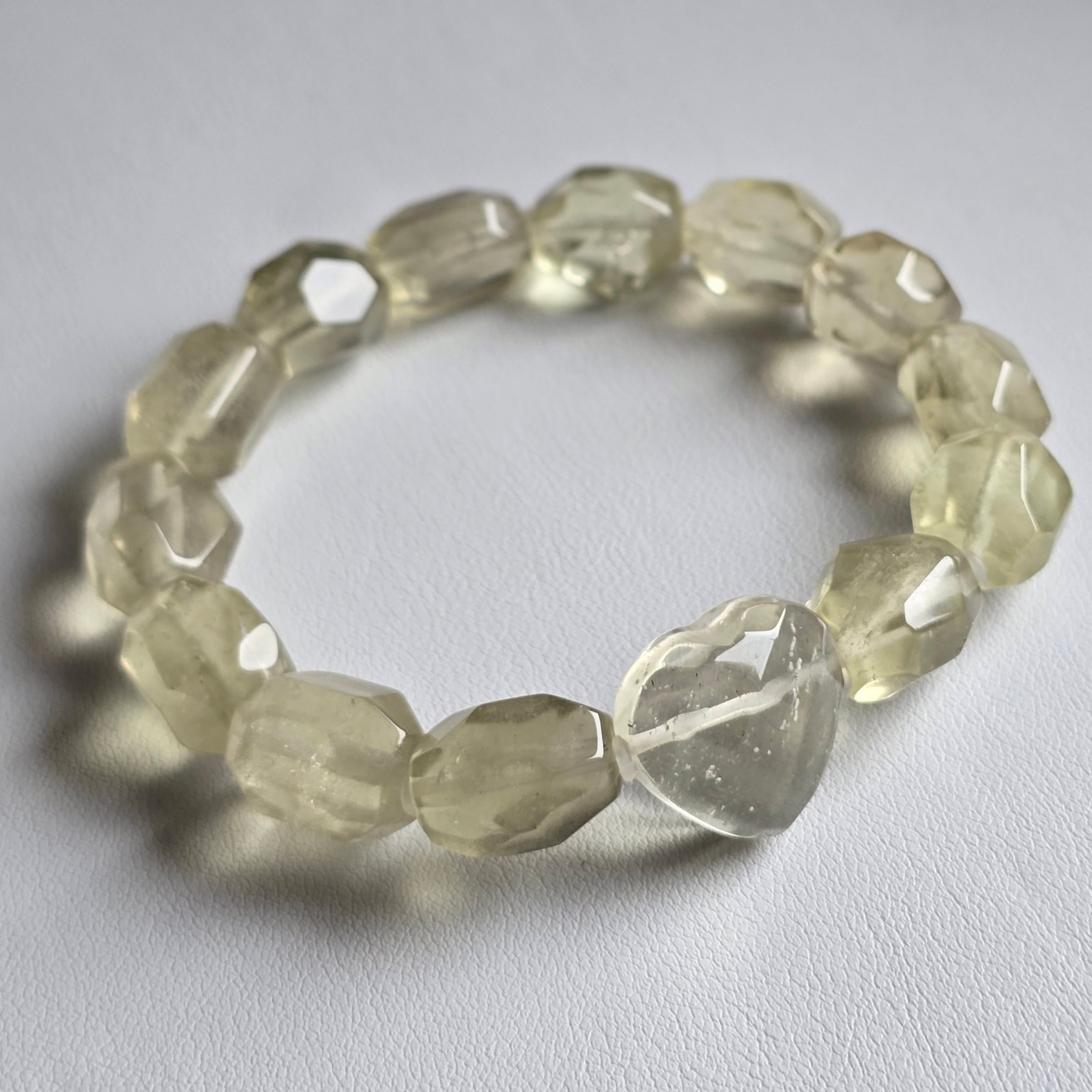不純物が少ないクリアレモンイエローの最高級のリビアングラスです。美しい透明感とセンターのハート型がキュート!一つ一つ異なるユニークな形が特徴のリビアングラスタンブルブレスレットは、手首に輝きを与え、個性を引き立てます。